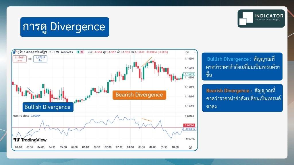 เราสามารถดู Divergence หรือ สัญญาณเตือนการกลับตัว จาก Momentum ได้ โดย