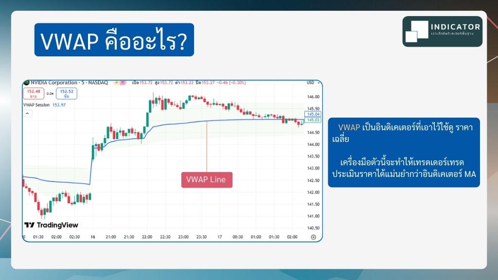 VWAP เป็นอินดิเคเตอร์ที่ ใช้สำหรับแสดงราคาเฉลี่ย โดยการนำ ราคาจริงของสินทรัพย์มาคำนวณกับปริมาณการซื้อขาย เพื่อให้เทรดเดอร์สามารถประเมินราคากลางที่สะท้อนปริมาณซื้อขายจริงได้แม่นยำกว่าการใช้แค่ราคาเฉลี่ยธรรมดา (SMA)